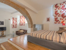 "Lunaria", 2-rums-lägenhet 80 m2, på bottenvåningen. Objekt passande för 2 vuxna + 1 barn. Rymlig och ljus, fullständigt renoverad år 2012, mycket smakfullt och stiligt inredd: vardags-/matrum med öppen spis, matbord, sat-TV och internationella TV-kanaler (flatscreen TV), stereoanläggning. Utgång till trädgården. 1 öppet stort dubbelrum med 1 säng (160 cm), 1 bäddsoffa och dusch/bidé/toalett. Öppet kök (ugn, diskmaskin, Gasspis, 6 gasflammor, brödrost, vattenkokare, frys, elektrisk kaffemaskin). Uppvärmning (extra). Parkettgolv, naturstensgolv. Terrass. Terrassmöbler, utegrill, vilstolar (2). Vacker panoramautsikt på landskapet. Till förfogande: myggnät, hög barnstol, barnsäng för barn under 2 år, hårtork. Internet (Trådlös LAN [WLAN] , gratis). Parkeringsplats nr 1 (1 Bil). Notera: lämpligt för barnfamiljer. Rökfri lägenhet. 1 husdjur/hund tillåtet. Privat entré, privat entré. Inga obligatoriska extra avgifter betalas på plats förutom lokal skatt. Sängkläder, handdukar, slutstädning och energikostnader är inkluderade.- Utrustning