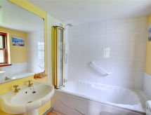 4-rums-stuga med 2 våningar. Rymlig och ljus, komfortabelt och smakfullt: vardagsrum med TV, flatscreen TV och DVD. 1 dubbelrum med 1 dubbelsäng och dusch/toalett. Kök (4 kokplattor, ugn, diskmaskin, mikrovågsugn, frys) med matbord. Badkar/dusch/toalett. Övre våning: 2 rum, till varje rum hör 2 sängar. Uppvärmning. Terrassmöbler. Till förfogande: tvättmaskin, torktumlare, hög barnstol, barnsäng för barn under 2 år. Internet (Trådlös LAN [WLAN] , gratis). Notera: rökfritt hus.- Utrustning