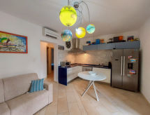 "Mahalo", 4-rums-lägenhet 80 m2, på bottenvåningen. Delvis renoverad år 2022, komfortabelt och mysigt inredd: vardags-/matrum med TV och luftkonditionering. Utgång till verandan. 1 dubbelrum med TV och luftkonditionering. 1 dubbelrum med TV. 1 litet rum med 1 x 2 våningssängar (80 cm, längd 190 cm). Kokvrå (diskmaskin, 6 gasflammor, mikrovågsugn, elektrisk kaffemaskin). Utgång till verandan. Dusch/bidé/toalett. Luftkonditionering (extra). Terrass täckt, stor terrass, liten trädgård. Terrassmöbler, vilstolar (2). Begränsad utsikt på landskapet och lagunen. Till förfogande: tvättmaskin, barnsäng. Internet (Trådlös LAN [WLAN] , gratis). Notera: privat entré, privat entré.- Utrustning