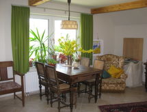 1-rums-lägenhet 25 m2 på 1. våningen. Smakfullt inredd: vardags-/sovrum med snedtak med 1 dubbelsäng, matbord, sat-TV och radio. Utgång till balkongen. Kokvrå (2 kokplattor, miniugn, brödrost, vattenkokare, elektrisk kaffemaskin). Dusch/toalett. Trädgårdssittplats. Terrassmöbler, balkongmöbler, vilstolar (2). Vacker utsikt på trädgården. Till förfogande: Internet (Trådlös LAN [WLAN] , gratis). Notera: rökfri lägenhet. Brandvarnare.- Utrustning