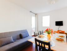 3-rums-lägenhet 70 m2 på 1. våningen, sydostläge. Delvis renoverad år 2016: vardags-/matrum med 1 bäddsoffa för 2 personer (130 cm, längd 200 cm), TV. 1 rum med 1 utdragbar säng (2 pers. 2 x 90 cm, längd 190 cm). Utgång till balkongen. 1 rum med 1 fransk säng (140 cm, längd 190 cm). Utgång till balkongen. Kök (2 kokplattor, miniugn, mikrovågsugn, frys). Dusch, sep. Toalett. Eluppvärmning. 2 balkonger. Terrassmöbler. Till förfogande: Internet (Trådlös LAN [WLAN] , extra). Notera: lägenhet mot gatan. Max 1 husdjur/hund tillåtet. Brandvarnare. Annonsering av en privatperson enligt artikel 155, IV, CGI.- Kännetecken för boendet