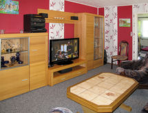 Enfamiljshus "Mary". 800 m från centrumet av Karlsburg, i utkanten, 20 km från centrumet av Anklam, 20 km från centrumet av Greifswald, 25 km från havet. För gemensamt bruk: tomt 2'000 m2 (inhägnad), välskött trädgård med gräsmatta och träd. Barnlekplats (rutschbana, gunga). Carport. Stormarknad 1 km, järnvägsstation "Karlsburg" 1 km, sandstrand "Zinnowitz" 25 km. Notera: ägaren bor i samma hus. Ägaren har en hund. Djur i området.Interior