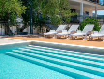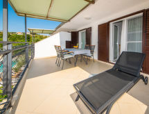 3-rums-lägenhet 50 m2 på 2. våningen. Vackert inredd: vardags-/matrum med sat-TV. Utgång till terrassen. Ingång med luftkonditionering. 1 rum med 1 fransk säng (160 cm, längd 200 cm). Utgång till terrassen. 1 rum med 2 sängar (90 cm, längd 200 cm). Öppet kök (4 kokplattor, ugn, mikrovågsugn, frys, elektrisk kaffemaskin). Dusch/bidé/toalett. Varmluftsuppvärmning. Terrass 20 m2 täckt. Terrassmöbler. Vidsträckt utsikt på havet. Till förfogande: tvättmaskin. Internet (Trådlös LAN [WLAN] , gratis). Notera: privat entré, privat entré.- Utrustning
