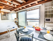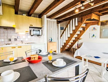 2-rums-lägenhet 29 m2 med 2 våningar på 2. våningen, sydostläge. Vardags-/matrum med 1 utdragbar säng (2 pers.), TV. Utgång till balkongen. Kokvrå (2 kokplattor, ugn, mikrovågsugn). Badkar/toalett. Övre våning: 1 rum med snedtak med 1 fransk säng (140 cm). Balkong 5 m2. Balkongmöbler. Vacker utsikt på havet. Till förfogande: tvättmaskin, hårtork. Internet (Trådlös LAN [WLAN] , extra). Parkeringsplats nr 14. Notera: TV bara FR. Brandvarnare.- Kännetecken för boendet