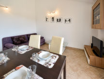 2-rums-lägenhet 30 m2 på 2. våningen, sydvästläge. Vardags-/matrum 16 m2 med 1 bäddsoffa för 2 personer (150 cm, längd 200 cm), sat-TV (flatscreen TV), luftkonditionering. Utgång till terrassen. 1 rum med snedtak, takhöjd 180 - 250 cm med 1 fransk säng (160 cm, längd 200 cm). Öppet kök (4 kokplattor, ugn, frys). Dusch/toalett. Terrass 7 m2, täckt. Terrassmöbler. Vidsträckt utsikt på havet. Till förfogande: Internet (Trådlös LAN [WLAN] , gratis). Notera: rökfritt hus.- Utrustning