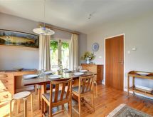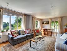 5-rums-stuga med 3 våningar. Komfortabelt och smakfullt: ingång. Övre våning: vardags-/matrum med TV (flatscreen TV), DVD och vedugn. Litet vardagsrum. Utgång till balkongen. Kök (4 kokplattor, ugn, diskmaskin, mikrovågsugn, frys). 2:a våningen 2 dubbelrum, till varje rum hör, 1 dubbelsäng. 1 rum med 1 säng. 2 badkar/duschar/toaletter. Oljeuppvärmning. Liten balkong, trädgårdssittplats, trädgård. Terrassmöbler, utegrill, vinterträdgård. Utsikt på floden. Till förfogande: tvättmaskin, torktumlare. Internet (Trådlös LAN [WLAN] , gratis). Parkeringsplats nr 2. Notera: ej lämpligt för barn under 8 år. Rökfritt hus.- Kännetecken för boendet