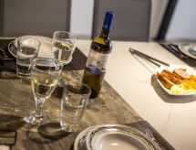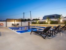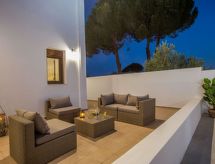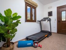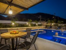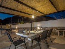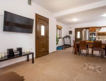 "Mona Lisa", 3-rums-villa 150 m2 med 2 våningar. Rymlig och ljus, komfortabelt och vackert inredd: öppet vardags-/sovrum med 1 bäddsoffa för 2 personer och sat-TV (flatscreen TV). Utgång till trädgården, till swimmingpoolen. Öppet kök (ugn, diskmaskin, 4 kokplattor - glaskeramikhäll, mikrovågsugn, elektrisk kaffemaskin) med matbord. Dusch/toalett. Luftkonditionering. Övre våning: (stege utan räcke) 1 dubbelrum med 1 dubbelsäng och dusch/toalett. Utgång till balkongen. 1 dubbelrum med 1 dubbelsäng. Dusch/toalett. Luftkonditionering. Liten balkong. Vacker utsikt på havet. Till förfogande: tvättmaskin, strykjärn, hårtork. Internet (Trådlös LAN [WLAN] , gratis). 1188231- Utrustning