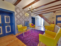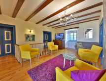 8-rums-lägenhet 158 m2 med 2 våningar på 1. våningen, sydläge. Rustikt och smakfullt inredd: vardagsrum 23 m2 med sat-TV (flatscreen TV), DVD. Utgång till terrassen. Vardags-/matrum med köksblock och luftkonditionering. 1 rum med 1 dubbelsäng (2 x 90 cm, längd 200 cm), sat-TV (flatscreen TV). Vardags-/matrum med köksblock och sat-TV (flatscreen TV). 1 rum med 1 fransk säng (1 x 190 cm, längd 200 cm), sat-TV (flatscreen TV). Matrum 15 m2. 1 rum med 1 säng (80 cm, längd 190 cm), 1 dubbelsäng (2 x 90 cm, längd 200 cm), sat-TV (flatscreen TV), luftkonditionering. Öppet kök (4 kokplattor, ugn, diskmaskin, frys). Dusch/toalett, 3 duschar/bidéer/toaletter. Takvåning: (spiraltrappa) 1 rum, takhöjd 70 - 230 cm med 1 fransk säng (1 x 180 cm, längd 190 cm), dusch/toalett och sat-TV (flatscreen TV), luftkonditionering. Terrass 26 m2, sydläge. Terrassmöbler. Härlig panoramautsikt på havet och landskapet. Till förfogande: tvättmaskin. Internet (Trådlös LAN [WLAN] , gratis).- Utrustning