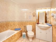 2-rums-lägenhet 45 m2 på 2. våningen. Praktiskt och modernt inredd: vardags-/matrum med 1 bäddsoffa för 2 personer (1 x 130 cm, längd 190 cm), digital-TV, internationella TV-kanaler, flatscreen TV, luftkonditionering och varmluftsuppvärmning. 1 rum med 1 fransk säng (150 cm). Öppet kök (2 kokplattor - glaskeramikhäll, mikrovågsugn, elektrisk kaffemaskin) med bar. Badkar/toalett. Terrass 12 m2. Mycket vacker utsikt på havet, bergen, swimming-poolen och trädgården. Till förfogande: tvättmaskin, kassaskåp, hårtork. Internet (Trådlös LAN [WLAN] ). Parkeringsplats (täckt). HUTG001457- Utrustning