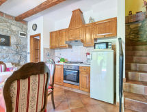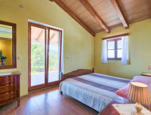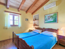 3-rums-hus 63 m2 med 2 våningar. Vardags-/matrum med 1 bäddsoffa (140 cm, längd 200 cm), öppen spis och sat-TV (flatscreen TV). Utgång till trädgården, till terrassen. Öppet kök (4 kokplattor, ugn, diskmaskin, mikrovågsugn, elektrisk kaffemaskin). Dusch/bidé/toalett. Övre våning: 1 rum med 1 fransk säng (160 cm, längd 200 cm), luftkonditionering. Utgång till terrassen. 1 rum med 2 sängar (90 cm, längd 200 cm), luftkonditionering. Sep. Toalett. 2 terrasser 15 m2, täckt. Terrassmöbler, utegrill (flyttbar), vilstolar. Härlig panoramautsikt på havet och landskapet. Till förfogande: hårtork. Internet (Trådlös LAN [WLAN] , gratis). 1 husdjur/hund tillåtet.- Utrustning