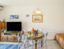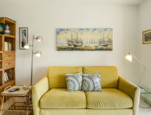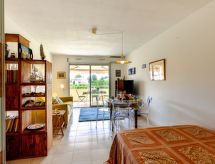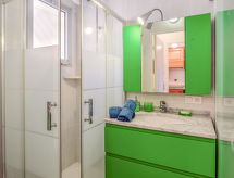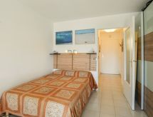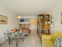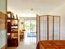 1-rums-studio 32 m2 på 4. våningen. Komfortabelt inredd: vardags-/matrum 20 m2 med 1 säng (140 cm, längd 190 cm), 1 bäddsoffa (140 cm, längd 190 cm), TV (flatscreen TV), DVD och luftkonditionering. Utgång till terrassen. Litet kök (4 kokplattor - glaskeramikhäll, vattenkokare, mikrovågsugn, elektrisk kaffemaskin, Kapslar till kaffemaskin (dolce gusto) extra). Dusch/toalett. Uppvärmning. Terrass 8 m2. Balkongmöbler. Utsikt på trädgården. Till förfogande: strykjärn, barnsäng, hårtork. Internet (Trådlös LAN [WLAN] ). Parkeringsplats nr 16 (1 Bil). Notera: rökfri lägenhet. Annonsering av en privatperson enligt artikel 155, IV, CGI.- Kännetecken för boendet