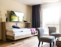 2-rums-lägenhet 55 till 56 m2. Komfortabelt och modernt inredd: vardags-/matrum med 1 bäddsoffa (80 cm, längd 200 cm), 1 väggsäng (90 cm, längd 200 cm), kabel-TV (flatscreen TV). 1 dubbelrum med 1 dubbelsäng. Öppet kök (ugn, diskmaskin, 4 Induktionshäll, vattenkokare). Badkar/toalett. Balkong. Balkongmöbler, förråd. Vacker utsikt på bergen och landskapet. Till förfogande: kassaskåp, hårtork. Internet (Trådlös LAN [WLAN] ). Notera: rökfri lägenhet. Max 1 husdjur/hund tillåtet.- Kännetecken för boendet