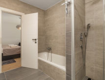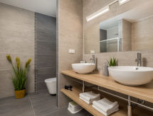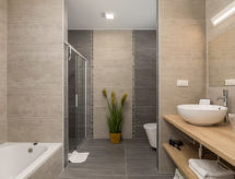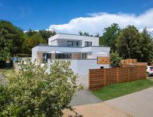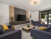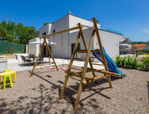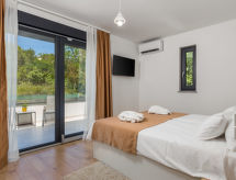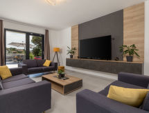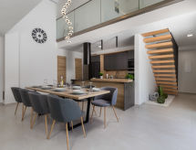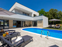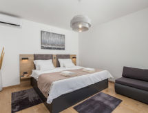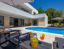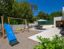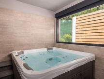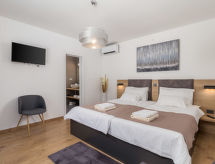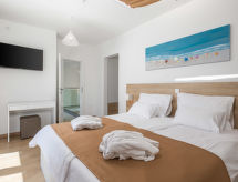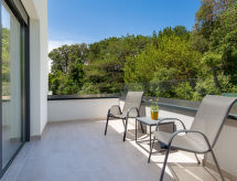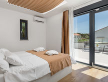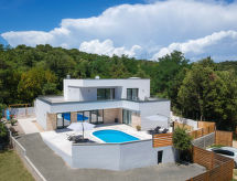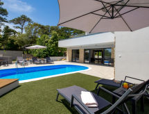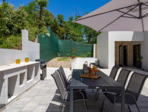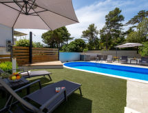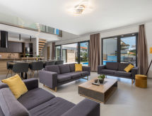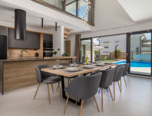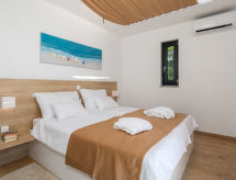 4-rums-villa med 2 våningar. Modernt och smakfullt inredd: vardags-/matrum 40 m2 med sat-TV och luftkonditionering. Utgång till terrassen. 1 rum med 1 bäddsoffa (80 cm, längd 200 cm), 1 fransk säng (200 cm, längd 210 cm), badkar/dusch/toalett och luftkonditionering. Utgång till terrassen, till swimmingpoolen. Öppet kök (ugn, diskmaskin, 3 Induktionshäll, brödrost, vattenkokare, mikrovågsugn, frys, elektrisk kaffemaskin). Sep. Toalett. Golvvärme. Övre våning: 1 rum med takfönster med 1 fransk säng (180 cm, längd 200 cm), badkar/toalett och luftkonditionering. Utgång till balkongen. 1 rum med 2 sängar (90 cm, längd 200 cm), 1 bäddsoffa (80 cm, längd 200 cm), badkar/toalett och luftkonditionering. Utgång till balkongen. Balkong, terrass 30 m2. Terrassmöbler, balkongmöbler, vilstolar. Till förfogande: strykjärn, myggnät, hög barnstol, barnsäng, hårtork. Internet (Trådlös LAN [WLAN] , gratis). Notera: rökfritt hus. 1 husdjur/hund tillåtet.- Kännetecken för boendet