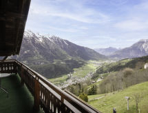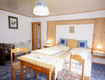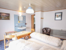 3-rums-lägenhet 80 m2, på övervåningen. Delvis sluttande tak, mysigt inredd: vardags-/matrum med 1 bäddsoffa, köksblock och sat-TV. Utgång till balkongen. 1 dubbelrum med 1 dubbelsäng och handfat. Utgång till balkongen. 1 litet barnrum med snedtak med 1 säng. 1 dubbelrum med snedtak med 1 dubbelsäng och handfat. (ugn, diskmaskin, 4 kokplattor - glaskeramikhäll, brödrost, vattenkokare, mikrovågsugn, elektrisk kaffemaskin). Badkar/toalett, dusch. Parkettgolv. Terrassmöbler, utegrill. Vidsträckt utsikt på bergen och dalen. Till förfogande: Internet (Trådlös LAN [WLAN] , gratis). Notera: rökfri lägenhet. Privat entré, privat entré, brandvarnare.- Kännetecken för boendet