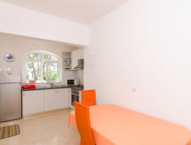 1-rums-lägenhet 45 m2, på bottenvåningen, sydostläge. Vackert och mysigt inredd: 1 rum 25 m2 med 1 dubbelsäng (2 x 90 cm, längd 200 cm), sat-TV och luftkonditionering. Kök 9 m2 (4 kokplattor, ugn, diskmaskin, frys) med matbord, luftkonditionering. Utgång till terrassen. Badkar/toalett. Stor terrass 30 m2. Terrassmöbler. Utsikt på havet. Till förfogande: Internet (Trådlös LAN [WLAN] , gratis).- Utrustning