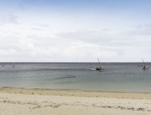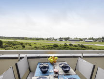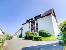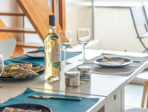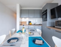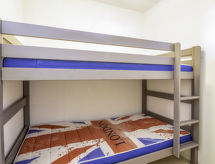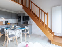 3-rums-lägenhet 35 m2 med 2 våningar på 3. våningen. Komfortabelt inredd: vardags-/matrum med TV (flatscreen TV). Utgång till terrassen. 1 rum med 1 x 2 våningssängar (80 cm, längd 180 cm). Kök (ugn, diskmaskin, 3 kokplattor - glaskeramikhäll, frys, elektrisk kaffemaskin, kombinerad mikrovågsugn). Övre våning: 1 rum med 1 fransk säng (1 x 160 cm, längd 190 cm). Dusch/toalett. Eluppvärmning. Liten terrass 5 m2. Terrassmöbler. Vidsträckt utsikt på havet. Parkeringsplats nr 8. Notera: brandvarnare.- Kännetecken för boendet