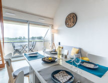 Residens "Plein Sud", med 3 våningar. I orten 2 km från centrumet av Quiberon, 300 m från havet, 300 m från stranden. Stormarknad 1 km, sandstrand 300 m, bad med varma källor "Thalassothérapie de Quiberon" 1.8 km. Marina 450 m, golfbana (9 hål) 800 m. Närbelägna sevärdheter: Quiberon et la côte sauvage, Saint Pierre Quiberon 6 km, Carnac et les alignements 19 km, Auray et le Port de St Goustan 30 km, Vannes 45 km, Lorient 65 km.Interior