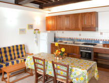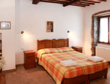 "Pomele", 3-rums-lägenhet 62 till 74 m2, på bottenvåningen. Rustikt inredd: vardags-/matrum med öppen spis (endast för dekoration), matbord och sat-TV. 1 rum med 1 dubbelsäng och dusch/toalett. 1 rum med 2 sängar. Utgång till terrassen. Kokvrå (ugn, 4 gasflammor, brödrost, vattenkokare, frys). Dusch/toalett. Gasuppvärmning (extra), luftkonditionering (extra). Terrass täckt, trädgårdssittplats. Terrassmöbler. Utsikt på sjön. Till förfogande: hög barnstol, barnsäng. Internet (Trådlös LAN [WLAN] , gratis). Notera: rökfritt hus.- Utrustning