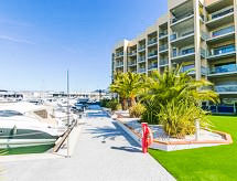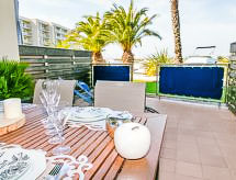 2-rums-lägenhet 42 m2, på bottenvåningen, sydvästläge. Rymlig och ljus, mycket modernt och luxuöst inredd: vardags-/matrum med 1 bäddsoffa för 2 personer, matbord, sat-TV och digital-TV (flatscreen TV), luftkonditionering, varmluftsuppvärmning och elektrisk fönsterlucka. Utgång till terrassen, till swimmingpoolen, mot söder och mot väst. 1 rum med 1 fransk säng (1 x 140 cm, längd 190 cm), luftkonditionering, varmluftsuppvärmning och elektrisk fönsterlucka. Kök (ugn, diskmaskin, 4 kokplattor - glaskeramikhäll, mikrovågsugn, frys, elektrisk kaffemaskin) med bar. Badkar/toalett. Stor terrass 20 m2. Terrassmöbler, vilstolar (2). Panoramautsikt på landskapet och kanalen. Till förfogande: tvättmaskin, torktumlare. Internet (Trådlös LAN [WLAN] , extra). Garage nr 90. Notera: rökfri lägenhet. TV bara ES, FR. HUTG037134- Utrustning