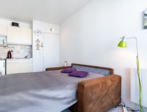 1-rums-studio 22 m2 på 5. våningen. Praktiskt och komfortabelt inredd: vardags-/matrum med 1 bäddsoffa för 2 personer (1 x 140 cm, längd 190 cm), TV (flatscreen TV). Utgång till balkongen. Alkov med 1 x 2 våningssängar (70 cm, längd 170 cm). Öppet kök (2 kokplattor, ugn, brödrost, vattenkokare, mikrovågsugn, frys, elektrisk kaffemaskin, Kapslar till kaffemaskin (Dolce Gusto) extra). Badkar/toalett. Eluppvärmning. Liten balkong 3 m2. Balkongmöbler. Begränsad utsikt på havet. Till förfogande: strykjärn, hårtork. Internet (Trådlös LAN [WLAN] , gratis). Parkeringsplats nr 383 (inhägnad, 1 Bil). Notera: brandvarnare. Annonsering av en privatperson enligt artikel 155, IV, CGI.- Kännetecken för boendet