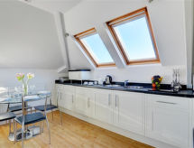 3-rums-lägenhet på 2. våningen. Modernt och stiligt inredd: öppet vardags-/matrum med matbord och TV (flatscreen TV), radio, CD och DVD. Utgång till balkongen. 2 dubbelrum, till varje rum hör, 1 dubbelsäng och TV. Kök (4 kokplattor, ugn, diskmaskin, mikrovågsugn, frys). Badkar/dusch/toalett. Uppvärmning. Balkongmöbler. Utsikt på viken. Till förfogande: tvättmaskin, torktumlare. Internet (Trådlös LAN [WLAN] , gratis). IPod-dockningsstation. Notera: rökfritt hus. TV bara EN.- Kännetecken för boendet