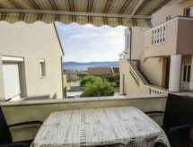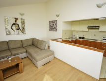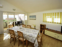 3-rums-lägenhet 70 m2 på 1. våningen, sydvästläge. Vardags-/matrum 40 m2 med sat-TV (flatscreen TV), luftkonditionering. Utgång till terrassen. 2 rum, till varje rum hör 2 sängar (90 cm, längd 200 cm), fläkt. Öppet kök (ugn, diskmaskin, 4 kokplattor - glaskeramikhäll, mikrovågsugn, frys, elektrisk kaffemaskin). Dusch/toalett. Terrass 8 m2. Terrassmöbler. Utsikt på havet. Till förfogande: Internet (Trådlös LAN [WLAN] , gratis). 1 husdjur/hund tillåtet.- Utrustning