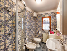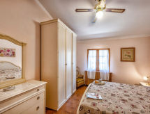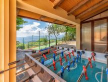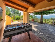 "Appartamento 2", 4-rums-lägenhet 100 m2 på 1. våningen. Komfortabelt och mysigt inredd: stort vardags-/matrum med öppen spis och TV (flatscreen TV). Utgång till trädgården, till loggian. 2 dubbelrum, till varje rum hör, fläkt. 1 rum med 2 sängar. Öppet kök (4 kokplattor, ugn, diskmaskin, frys). Dusch/bidé/toalett. Oljeuppvärmning (extra). Terrassmöbler. Mycket vacker utsikt på bergen och dalen. Till förfogande: tvättmaskin, hårtork. Internet (Trådlös LAN [WLAN] ). 1 husdjur/hund tillåtet.- Utrustning