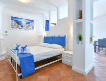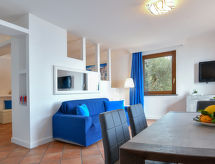 3-rums-ena hälften av ett parhus 80 m2, på bottenvåningen. Ljus, fullständigt renoverad år 2021, vackert och smakfullt inredd: öppet vardags-/sovrum med 1 bäddsoffa för 2 personer, matbord, köksblock, sat-TV och internationella TV-kanaler (flatscreen TV), luftkonditionering och varmluftsuppvärmning. Utgång till terrassen. 1 öppet dubbelrum. 1 dubbelrum med dusch/bidé/toalett, luftkonditionering och varmluftsuppvärmning. Utgång till trädgårdssittplatsen, till swimmingpoolen. Kokvrå (4 kokplattor, ugn, mikrovågsugn, frys, elektrisk kaffemaskin) med matbord. Dusch/bidé/toalett. Luftkonditionering, varmluftsuppvärmning. Terrass 25 m2, stor trädgårdssittplats, gräsmatta. Terrassmöbler, balkongmöbler, utegrill, vilstolar. Härlig panoramautsikt på havet, landskapet och orten. Till förfogande: tvättmaskin, strykjärn, hårtork. Internet (Trådlös LAN [WLAN] , gratis). Parkeringsplats (inhägnad, 1 Bil) vid huset. Notera: lämpligt för barnfamiljer ett dubbelrum är beläget utanför lägenheten. Rökfritt hus, parkeringsplats endast för små bilar. Brandsläckare. Sängkläder, handdukar, slutstädning och energikostnader är inkluderade. Inga obligatoriska extra avgifter betalas på plats förutom lokal skatt.- Utrustning