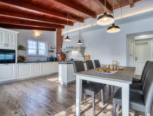 7-rums-hus 205 m2 med 2 våningar. Vardags-/matrum 45 m2 med sat-TV (flatscreen TV), luftkonditionering. Utgång till terrassen, till swimmingpoolen. Öppet kök (ugn, diskmaskin, 4 kokplattor - glaskeramikhäll, vattenkokare, mikrovågsugn, frys, elektrisk kaffemaskin). Sep. Toalett. Övre våning: 1 rum med 1 dubbelsäng (2 x 100 cm, längd 200 cm), dusch/toalett och sat-TV (flatscreen TV), luftkonditionering. 1 rum med 1 fransk säng (160 cm, längd 200 cm), dusch/toalett och sat-TV (flatscreen TV), luftkonditionering. 1 stort rum med 1 dubbelsäng (2 x 100 cm, längd 200 cm), dusch/toalett och sat-TV (flatscreen TV), luftkonditionering. Utgång till terrassen. (utetrappa) vardags-/matrum 50 m2 med sat-TV (flatscreen TV), luftkonditionering. Utgång till balkongen. 1 stort rum 20 m2 med 1 fransk säng (200 cm, längd 200 cm). 1 rum med 1 dubbelsäng (2 x 90 cm, längd 200 cm), dusch/toalett. Öppet kök (1 kokplatta, ugn, diskmaskin, 4 gasflammor, vattenkokare, mikrovågsugn, frys, elektrisk kaffemaskin). Dusch/toalett. Uppvärmning (extra). Balkong 12 m2, terrass 50 m2 täckt, terrass 15 m2. Terrassmöbler, elektrisk grill (flyttbar), vilstolar. Utsikt på swimming-poolen och landskapet. Till förfogande: tvättmaskin, kassaskåp, barnsäng, hårtork. Internet (Trådlös LAN [WLAN] , gratis).- Utrustning