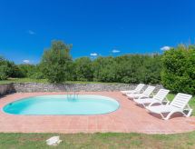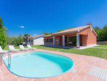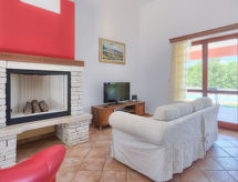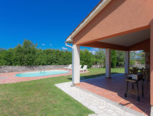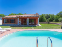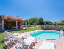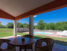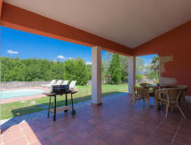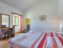 3-rums-hus 100 m2. Vardags-/matrum med sat-TV (flatscreen TV), luftkonditionering. Utgång till terrassen. 1 rum med 1 fransk säng (180 cm, längd 200 cm), 1 utdragbar säng (längd 190 cm). 1 rum med 2 sängar (90 cm, längd 200 cm), 1 utdragbar säng (längd 190 cm). Öppet kök (4 kokplattor, mikrovågsugn, frys, elektrisk kaffemaskin). 2 duschar/toaletter. Terrass 20 m2, täckt. Terrassmöbler, utegrill (flyttbar), vilstolar. Utsikt på swimming-poolen. Till förfogande: Internet (Trådlös LAN [WLAN] , gratis). 1 husdjur/hund tillåtet.- Utrustning