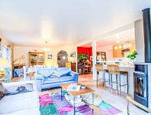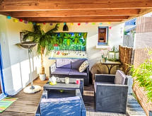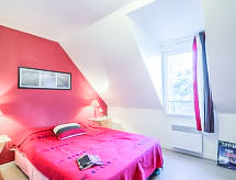 5-rums-hus 140 m2 med 2 våningar. Komfortabelt och vackert inrett: vardags-/matrum. Utgång till terrassen. 1 rum med 1 fransk säng (160 cm, längd 200 cm). Utgång till trädgården. Öppet kök (ugn, diskmaskin, 4 kokplattor - glaskeramikhäll, mikrovågsugn, frys, elektrisk kaffemaskin). Utgång till terrassen. Dusch, sep. Toalett, dubbelt handfat. Övre våning: öppen liten salong med TV (flatscreen TV), DVD. 1 rum med 1 fransk säng (140 cm, längd 190 cm). 1 rum med 2 sängar (90 cm, längd 190 cm). Utgång till balkongen. 1 rum med 1 fransk säng (140 cm, längd 190 cm). Utgång till balkongen. Badkar, sep. Toalett. Eluppvärmning. Terrass 12 m2. Terrassmöbler, utegrill. Till förfogande: tvättmaskin, torktumlare, strykjärn, hög barnstol. Internet (Trådlös LAN [WLAN] , gratis). Notera: brandvarnare.- Aktiviteter i närheten