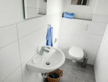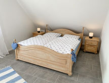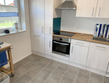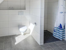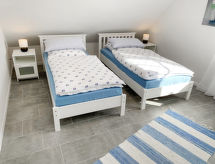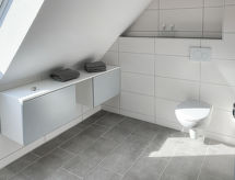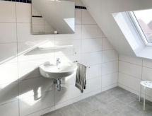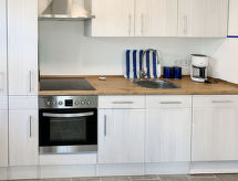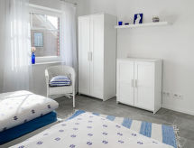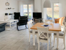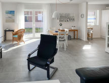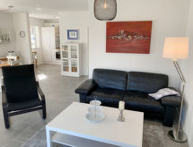 3-rums-ena hälften av ett parhus 115 m2 med 2 våningar, på bottenvåningen. Modernt och smakfullt inredd: vardags-/matrum med sat-TV (flatscreen TV), radio och stereoanläggning. Utgång till terrassen. Kokvrå (ugn, diskmaskin, 4 kokplattor - glaskeramikhäll, brödrost, vattenkokare, mikrovågsugn). Sep. Toalett. Övre våning: 1 rum med snedtak med 1 dubbelsäng (2 x 90 cm, längd 200 cm), sat-TV (flatscreen TV). 1 rum med snedtak med 2 sängar (90 cm, längd 200 cm). Dusch/toalett. Terrassmöbler, elektrisk grill. Till förfogande: tvättmaskin, hög barnstol, hårtork. Internet (Trådlös LAN [WLAN] , gratis). Notera: rökfritt hus. Brandvarnare.- Utrustning