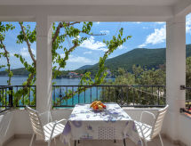 1-rums-lägenhet 16 m2 på 1. våningen, österläge. Studio med 1 fransk säng (160 cm, längd 200 cm), sat-TV och luftkonditionering. Utgång till terrassen. Öppet kök (2 kokplattor - glaskeramikhäll) med matbord. Dusch/toalett. Luftkonditionering (extra). Terrass 7 m2, täckt. Terrassmöbler. Härlig utsikt på havet. Till förfogande: Internet (Trådlös LAN [WLAN] , gratis). 1 husdjur/hund tillåtet.- Utrustning