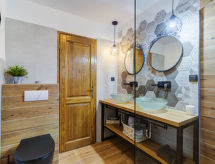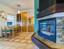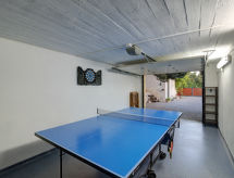 5-rums-hus 120 m2 med 2 våningar, sydläge. Vardags-/matrum med öppen spis och sat-TV (flatscreen TV), luftkonditionering. Utgång till terrassen. Öppet kök (4 kokplattor, ugn, diskmaskin, frys, elektrisk kaffemaskin). Dusch/toalett. Övre våning: 1 rum med 1 fransk säng (160 cm, längd 200 cm). 2 rum, till varje rum hör 2 sängar (90 cm, längd 200 cm). 1 rum med 1 dubbelsäng (2 x 80 cm, längd 200 cm). Dusch/toalett. Uppvärmning. Uppvärmning endast tillgängligt från 01.09. till 31.05. Terrass 20 m2, täckt. Terrassmöbler. Utsikt på landskapet. Till förfogande: hårtork, ved (gratis). Internet (Trådlös LAN [WLAN] , gratis).- Utrustning