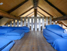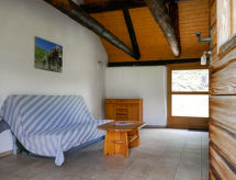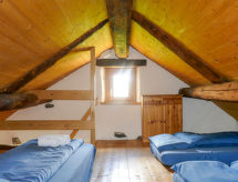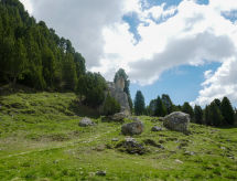 "Rustico Dolomia", 2-rums-stuga. Rymlig, delvis sluttande tak, enkelt och rustikt: öppet vardags-/matrum med radio. Utgång till trädgården. Öppet kök (Gasspis, 4 gasflammor). Nedre våning: 1 dubbelrum med 1 dubbelsäng (2 x 80 cm, längd 200 cm). Utgång till trädgården. Dusch/toalett. Veduppvärmning. 2:a våningen (brant trappa) mellanplan med 4 sängar (80 cm, längd 200 cm). Terrassmöbler. Härlig panoramautsikt på bergen, dalen och landskapet. Till förfogande: hög barnstol, barnsäng för barn under 2 år (extra). Notera: rökfritt hus. 1 husdjur/hund tillåtet. Brandsläckare.- Utrustning