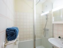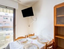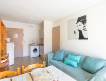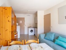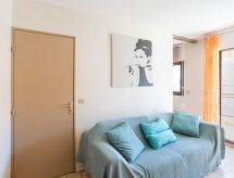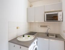 2-rums-lägenhet 27 m2 på 3. våningen. Objekt passande för 2 vuxna + 2 barn. Komfortabelt inredd: vardags-/matrum med TV (flatscreen TV). 1 rum med 1 fransk säng (1 x 140 cm). Alkov med 1 x 2 våningssängar (90 cm). Öppet kök (miniugn, ugn, 2 kokplattor - glaskeramikhäll, mikrovågsugn, elektrisk kaffemaskin). Dusch, sep. Toalett. Eluppvärmning, vattenberedare (100 liter). Till förfogande: tvättmaskin, strykjärn, hårtork. Internet (Trådlös LAN [WLAN] , extra). Parkeringsplats nr 233. Notera: rökfri lägenhet. TV bara FR. Brandvarnare.- Utrustning