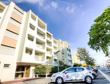 2-rums-lägenhet 55 m2 på 3. våningen. Rymlig, praktiskt inredd: stort vardags-/matrum med 1 bäddsoffa för 2 personer (1 x 140 cm, längd 190 cm), TV. Utgång till terrassen. 1 rum med 1 fransk säng (1 x 140 cm, längd 190 cm). Öppet kök (4 kokplattor, ugn, mikrovågsugn, frys, elektrisk kaffemaskin). Dusch, sep. Toalett. Eluppvärmning. Stor terrass 7 m2, sydläge och österläge. Terrassmöbler. Utsikt på orten. Till förfogande: Internet (Trådlös LAN [WLAN] , extra). Notera: rökfri lägenhet. Brandvarnare.- Kännetecken för boendet