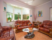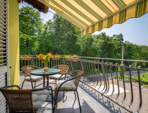 4-rums-lägenhet 100 m2 på 1. våningen. Vardags-/matrum 25 m2 med sat-TV (flatscreen TV), luftkonditionering. Utgång till terrassen. 1 rum med 1 fransk säng (160 cm, längd 190 cm). 1 rum med 2 sängar (80 cm, längd 190 cm). 1 rum med 1 bäddsoffa (120 cm, längd 190 cm). Öppet kök (4 kokplattor, ugn, diskmaskin, mikrovågsugn, frys, elektrisk kaffemaskin). Utgång till balkongen. Sep. Toalett, badkar/dusch/bidé/toalett. Balkong 4 m2, terrass 15 m2. Terrassmöbler, utegrill (flyttbar), vilstolar. Till förfogande: tvättmaskin. Internet (Trådlös LAN [WLAN] , gratis). 1 husdjur/hund tillåtet.- Kännetecken för boendet