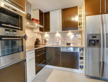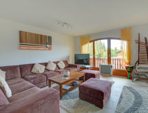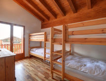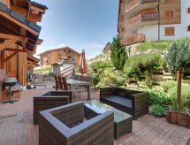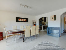 5-rums-radhus 150 m2. Komfortabelt inrett: vardags-/matrum med matvrå, kabel-TV, stereoanläggning och DVD. Utgång till terrassen. Öppet kök (4 kokplattor, ugn, diskmaskin, mikrovågsugn, elektrisk kaffemaskin). Dusch/toalett, bubbelbad. Övre våning: 3 dubbelrum, till varje rum hör, 3 franska sängar. 1 rum med 2 x 2 våningssängar. Utgång till balkongen. Badkar/toalett, dusch/toalett. Balkong, terrass. Terrassmöbler. Begränsad utsikt på bergen. Till förfogande: Internet (Trådlös LAN [WLAN] , gratis). Garage nr 3D, höjd 210 cm. Notera: rökfri lägenhet.- Kännetecken för boendet