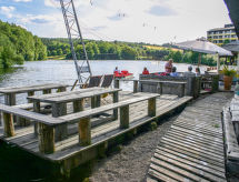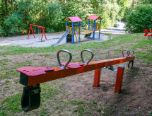 "Dorf 4/ Haus 27", 6-rums-hus 102 m2 med 2 våningar, på bottenvåningen. Smakfullt och mysigt inrett: vardags-/matrum 30 m2 med sat-TV (flatscreen TV), CD, stereoanläggning, DVD och DVD-samling tillgänglig. Utgång till terrassen, till trädgårdssittplatsen. 1 rum 14 m2 med 1 dubbelsäng (180 cm, längd 200 cm). Öppet kök 7 m2 (ugn, 4 kokplattor - glaskeramikhäll, mikrovågsugn, elektrisk kaffemaskin). Dusch/toalett. Övre våning: (spiraltrappa) 2 rum med snedtak, till varje rum hör 1 säng (90 cm, längd 200 cm). Utgång till balkongen. 2 rum med snedtak, till varje rum hör, 1 dubbelsäng (180 cm, längd 200 cm). Utgång till balkongen. Dusch/toalett. Gasuppvärmning, vattenberedare (100 liter). Liten balkong 5 m2, stor terrass 20 m2 täckt, trädgårdssittplats, gräsmatta 200 m2. Terrassmöbler, balkongmöbler, utegrill. Till förfogande: tvättmaskin, hög barnstol, hårtork. Internet (Trådlös LAN [WLAN] , gratis). Notera: rökfritt hus. Max 3 husdjur/hundar tillåtna. Brandvarnare, brandsläckare.- Utrustning