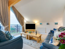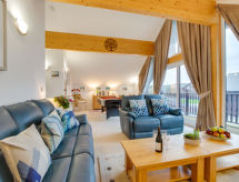 4-rums-radhus med 2 våningar. Rymlig och ljus, komfortabelt och smakfullt inrett: öppet vardagsrum med TV, flatscreen TV och DVD. 1 dubbelrum med 1 dubbelsäng och TV (flatscreen TV). 1 rum med 2 sängar. Öppet kök (4 kokplattor, ugn, mikrovågsugn, frys) med matbord. Badkar/dusch/toalett. Uppvärmning. Övre våning: 1 dubbelrum med 1 dubbelsäng, dusch/toalett och TV (flatscreen TV). 1 rum med 2 sängar och dusch/toalett. Öppet vardagsrum med TV (flatscreen TV), CD. Utgång till balkongen. Uppvärmning. Terrassmöbler. Vacker utsikt på landskapet. Till förfogande: Internet (Trådlös LAN [WLAN] , gratis). Notera: rökfritt hus.- Utrustning