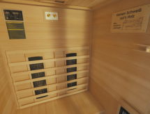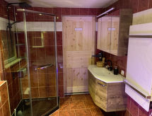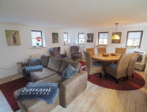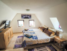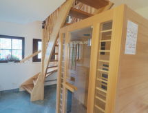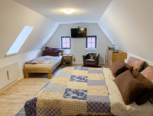 3-rums-hus 90 m2 med 2 våningar. Mysigt inrett: vardags-/matrum med matbord och sat-TV (flatscreen TV), radio, stereoanläggning och DVD-samling tillgänglig. Utgång till terrassen. Kök (ugn, diskmaskin, 4 kokplattor - glaskeramikhäll, brödrost, vattenkokare, mikrovågsugn, frys, elektrisk kaffemaskin) med matvrå. Dusch/toalett. Övre våning: (brant trappa) 1 rum med 1 dubbelsäng (180 cm, längd 200 cm), sat-TV (flatscreen TV). 1 rum med 1 säng (90 cm, längd 200 cm), 1 dubbelsäng (180 cm, längd 200 cm), sat-TV (flatscreen TV). Sep. Toalett. Eluppvärmning. Stor terrass 45 m2 täckt. Terrassmöbler, utegrill (flyttbar), vilstolar (2). Till förfogande: tvättmaskin, strykjärn, hårtork. Internet (Trådlös LAN [WLAN] , gratis). Notera: rökfritt hus. Max 2 husdjur/hundar tillåtna. Brandvarnare. Extra: Fyllt vinkylskåp (räknas efter konsumtion på plats).- Utrustning