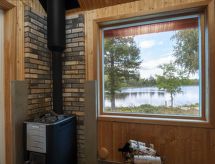"Skogstorp (BLE025)", 4-rums-hus 75 m2 med 2 våningar. Modernt och mysigt inrett: öppet vardags-/matrum med skjutdörr, panoramafönster med braskamin, matbord och DVD. Utgång till verandan. 1 rum med 1 dubbelsäng. 1 rum med 1 x 2 våningssängar. Öppet kök (ugn, 4 kokplattor - glaskeramikhäll, brödrost, vattenkokare, mikrovågsugn, frys, elektrisk kaffemaskin). Utgång till verandan. Dusch/toalett. Golvvärme. Övre våning: (brant trappa) 1 rum med 1 dubbelsäng. (brant trappa) litet galleri med sat-TV. Parkettgolv. Terrass täckt. Terrassmöbler, utegrill. Utsikt på sjön. Till förfogande: tvättmaskin, hög barnstol, barnsäng för barn under 2 år. Internet (Trådlös LAN [WLAN] , gratis). Notera: rökfri lägenhet. Brandvarnare, brandsläckare.- Utrustning