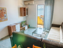 3-rums-lägenhet 70 m2 med 2 våningar på 2. våningen, sydläge. Vardags-/matrum 20 m2 med 1 bäddsoffa för 2 personer (120 cm, längd 200 cm), sat-TV (flatscreen TV), luftkonditionering. Utgång till balkongen. Öppet kök (2 kokplattor, mikrovågsugn, frys, elektrisk kaffemaskin). Dusch/toalett. Takvåning: 2 rum med snedtak, takhöjd 150 - 245 cm, till varje rum hör, 1 fransk säng (160 cm, längd 200 cm). Balkong 5 m2. Balkongmöbler. Härlig utsikt på havet. Till förfogande: Internet (Trådlös LAN [WLAN] , gratis). 1 husdjur/hund tillåtet.- Utrustning