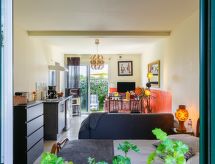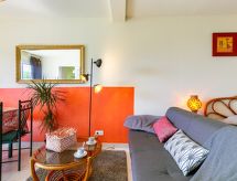 "Studio coquet", 1-rums-studio 30 m2, på bottenvåningen. Praktiskt och mysigt inredd: vardags-/matrum med 1 fransk säng (140 cm, längd 190 cm), TV (flatscreen TV). Utgång till trädgårdssittplatsen. Kokvrå (miniugn, ugn, 4 kokplattor - glaskeramikhäll, brödrost, vattenkokare, mikrovågsugn, elektrisk kaffemaskin). Dusch/toalett. Eluppvärmning. Liten trädgårdssittplats 20 m2. Terrassmöbler, utegrill (flyttbar), vilstolar (2). Till förfogande: tvättmaskin, strykjärn. Internet (Trådlös LAN [WLAN] , gratis). Notera: rökfritt hus. 1 litet husdjur/hund tillåtet. Brandvarnare.- Utrustning