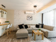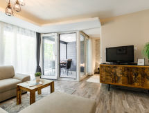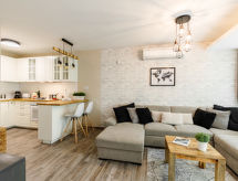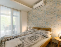 "Tarn", 3-rums-lägenhet 44 m2 på 1. våningen. Modernt och smakfullt inredd: vardags-/sovrum med 1 utdragbar säng (2 pers.), kabel-TV och luftkonditionering. Utgång till balkongen. 2 rum, till varje rum hör, 1 fransk säng (140 cm, längd 200 cm), luftkonditionering. Öppet kök (ugn, diskmaskin, brödrost, vattenkokare, frys). Dusch/toalett, sep. Toalett. Balkong 11 m2. Balkongmöbler, vilstolar (2). Till förfogande: tvättmaskin. Parkeringsplats (1 Bil), garage.- Utrustning