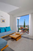 "Thea", 2-rums-villa 60 m2 med 2 våningar. Ljus, komfortabelt och vackert inredd: öppet vardags-/sovrum med 2 bäddsoffor och sat-TV (flatscreen TV), radio. Utgång till balkongen. Öppet kök (ugn, 4 kokplattor - glaskeramikhäll, mikrovågsugn, elektrisk kaffemaskin, Kapslar till kaffemaskin (Nespresso) extra). Dusch/toalett. Luftkonditionering. Nedre våning: (stege utan räcke) 1 dubbelrum med 1 dubbelsäng. Utgång till terrassen. Luftkonditionering. Balkong, liten terrass. Vacker utsikt på havet och landskapet. Till förfogande: tvättmaskin, kassaskåp, strykjärn, hårtork. Internet (Trådlös LAN [WLAN] , gratis). Notera: rökfritt hus. 1040 K910 0298 2701- Utrustning