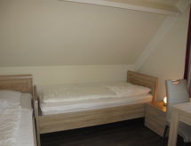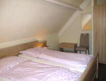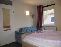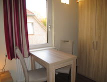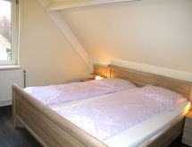 3-rums-ena hälften av ett parhus 65 m2 med 2 våningar. Ljus, mysigt inredd: vardags-/matrum med öppen spis och kabel-TV. Utgång till terrassen. Öppet kök (miniugn, diskmaskin, 4 kokplattor - glaskeramikhäll, brödrost, vattenkokare, mikrovågsugn, elektrisk kaffemaskin). Dusch/toalett. Övre våning: 1 rum med 1 dubbelsäng. 1 rum med 2 sängar. Gasuppvärmning. Terrass, gräsmatta. Terrassmöbler. Till förfogande: hög barnstol, barnsäng. Notera: max 1 husdjur/hund tillåtet. Brandvarnare.- Utrustning