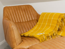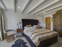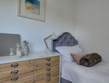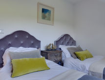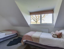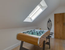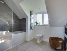 6-rums-stuga med 2 våningar. Rymlig och ljus, komfortabelt och smakfullt: öppet vardags-/matrum med matbord, TV, flatscreen TV och DVD. Ingång. 1 dubbelrum med 1 dubbelsäng och dusch/toalett. Öppet kök (4 kokplattor, ugn, mikrovågsugn, frys). Dusch/toalett. Uppvärmning. Övre våning: 2 dubbelrum, till varje rum hör, 1 dubbelsäng. 2 rum, till varje rum hör 2 sängar. Badkar/dusch/toalett. Uppvärmning. Vacker utsikt på orten. Till förfogande: tvättmaskin, torktumlare. Notera: rökfritt hus. 2 husdjur/hundar tillåtna.- Utrustning