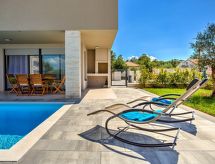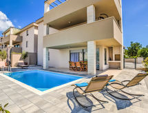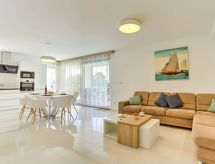 4-rums-lägenhet 122 m2, på bottenvåningen, sydläge. Vackert och modernt inredd: vardags-/matrum 35 m2 med sat-TV (flatscreen TV), luftkonditionering. Utgång till terrassen, till swimmingpoolen. 2 rum, till varje rum hör, 1 fransk säng (180 cm, längd 200 cm), dusch/toalett och sat-TV (flatscreen TV), luftkonditionering. 1 rum med 2 sängar (90 cm, längd 200 cm), luftkonditionering. Öppet kök (ugn, diskmaskin, 4 kokplattor - glaskeramikhäll, mikrovågsugn, frys, elektrisk kaffemaskin). Dusch/toalett. Uppvärmning. Terrass 100 m2 täckt. Terrassmöbler. Till förfogande: tvättmaskin, kassaskåp, hög barnstol, barnsäng, hårtork. Internet (Trådlös LAN [WLAN] , gratis). Parkeringsplats (inhägnad).- Utrustning